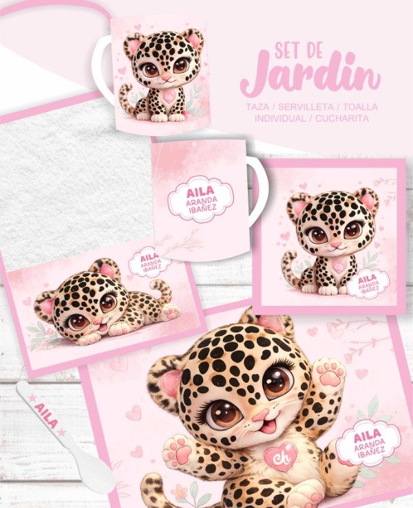 Set de jardin incluye taza, cuchara, servilleta, individual y toalla, personalizado con nombre