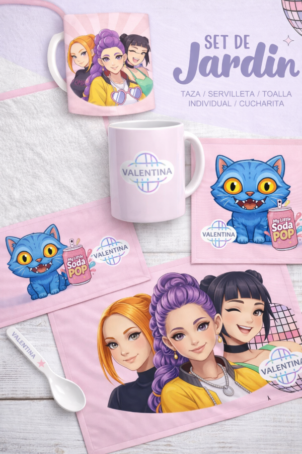 Set de jardin incluye taza, cuchara, servilleta, individual y toalla, personalizado con nombre
